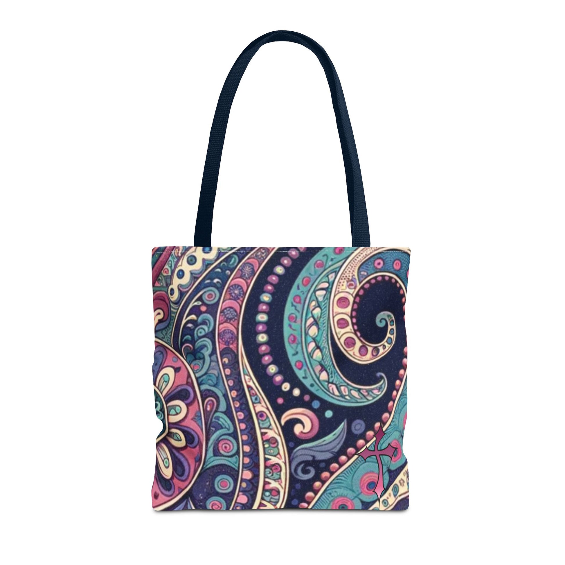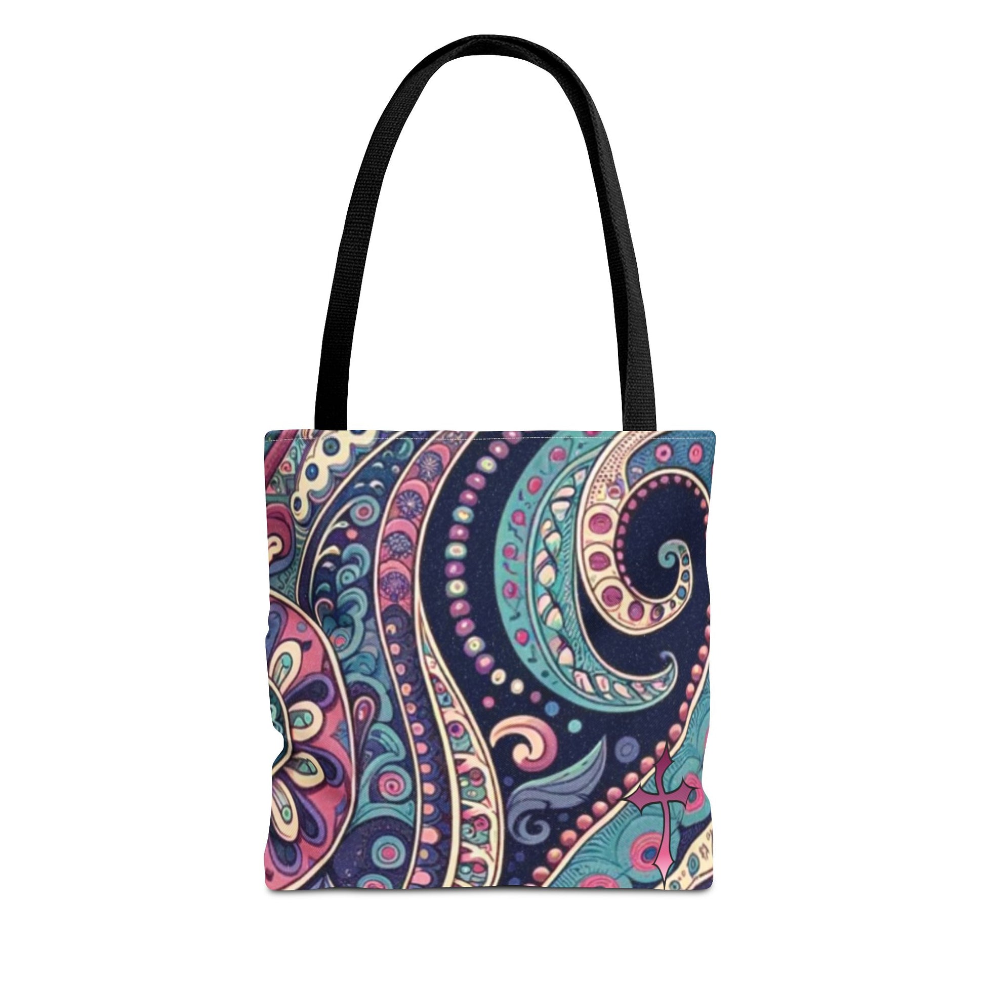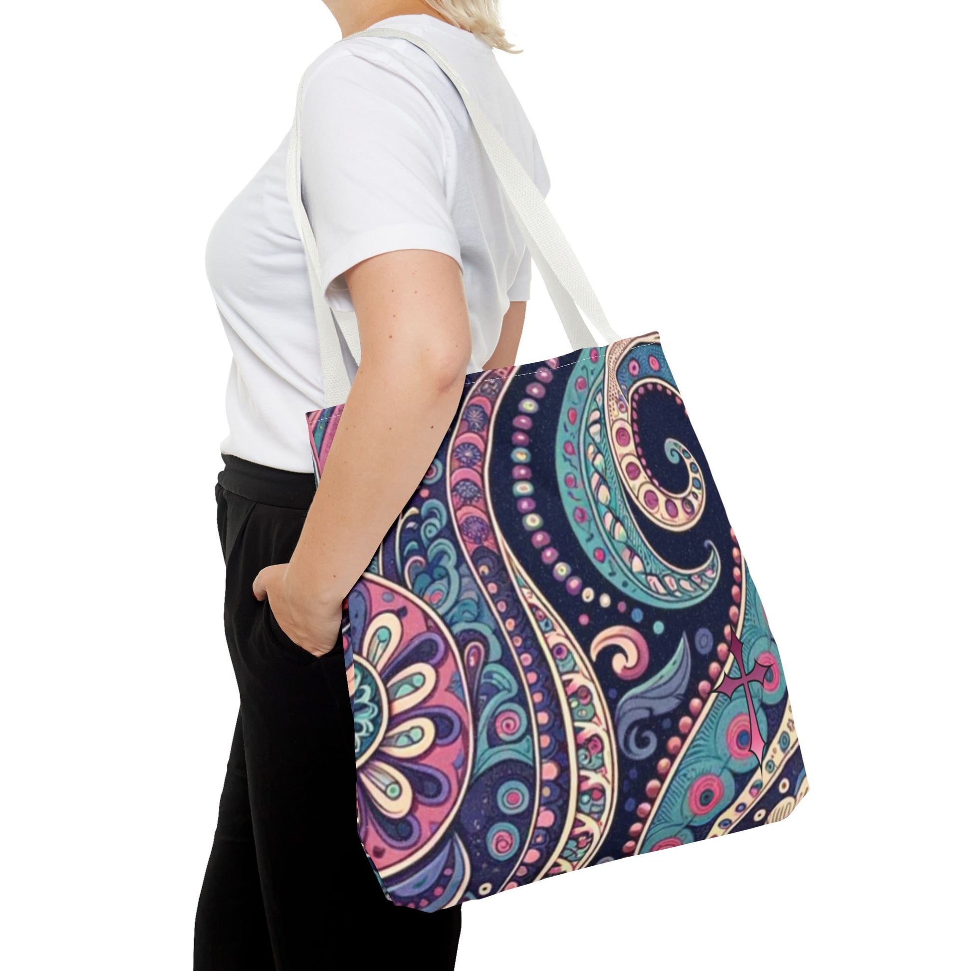 This Paisley Tote Bag with Faith design in Blue gives a bohemian and spiritual vibe. Perfect for those who appreciate unique patterns and want to carry their belongings in style. Ideal for everyday use, shopping, or as a thoughtful gift for friends or family. Relevant for spiritual holidays or occasions.